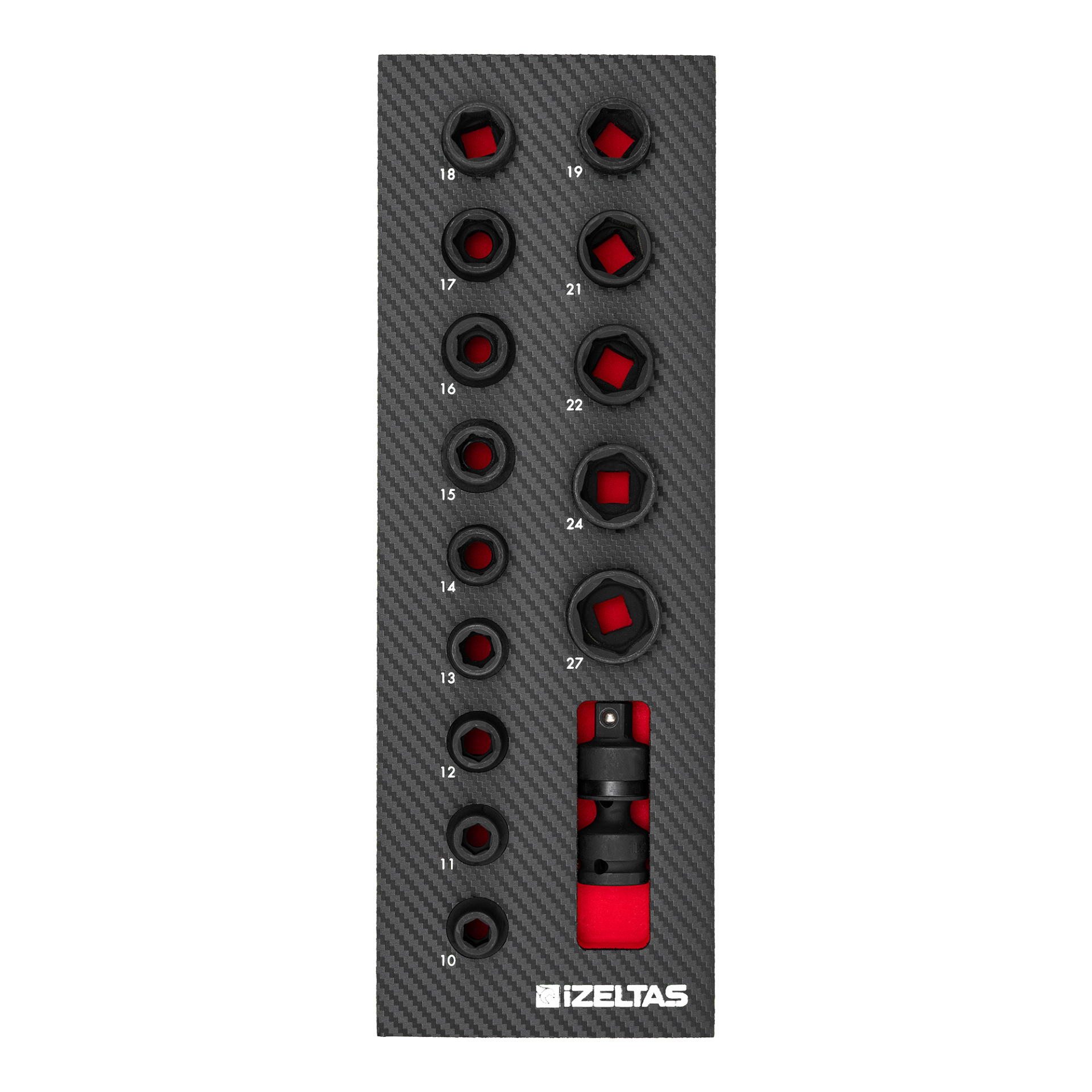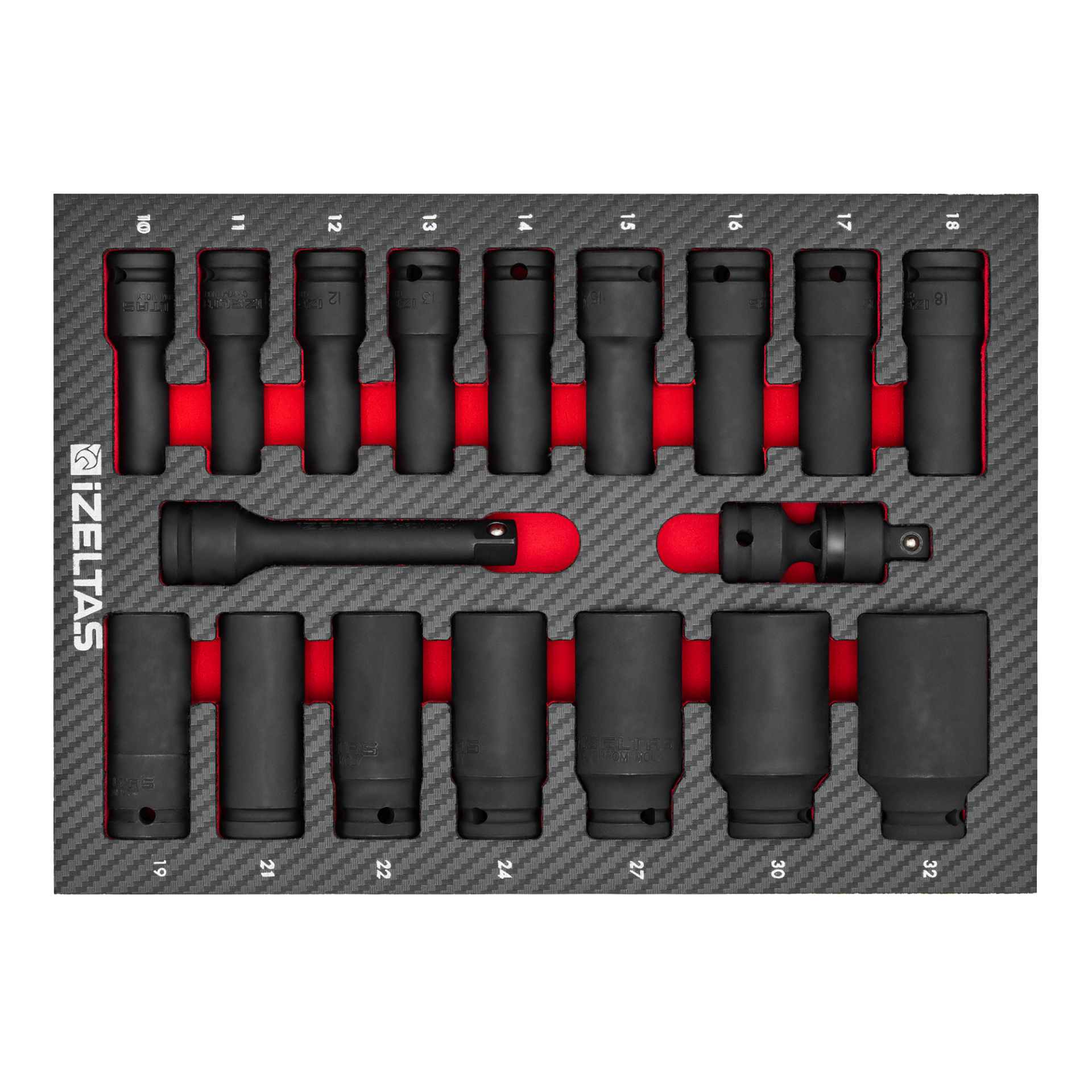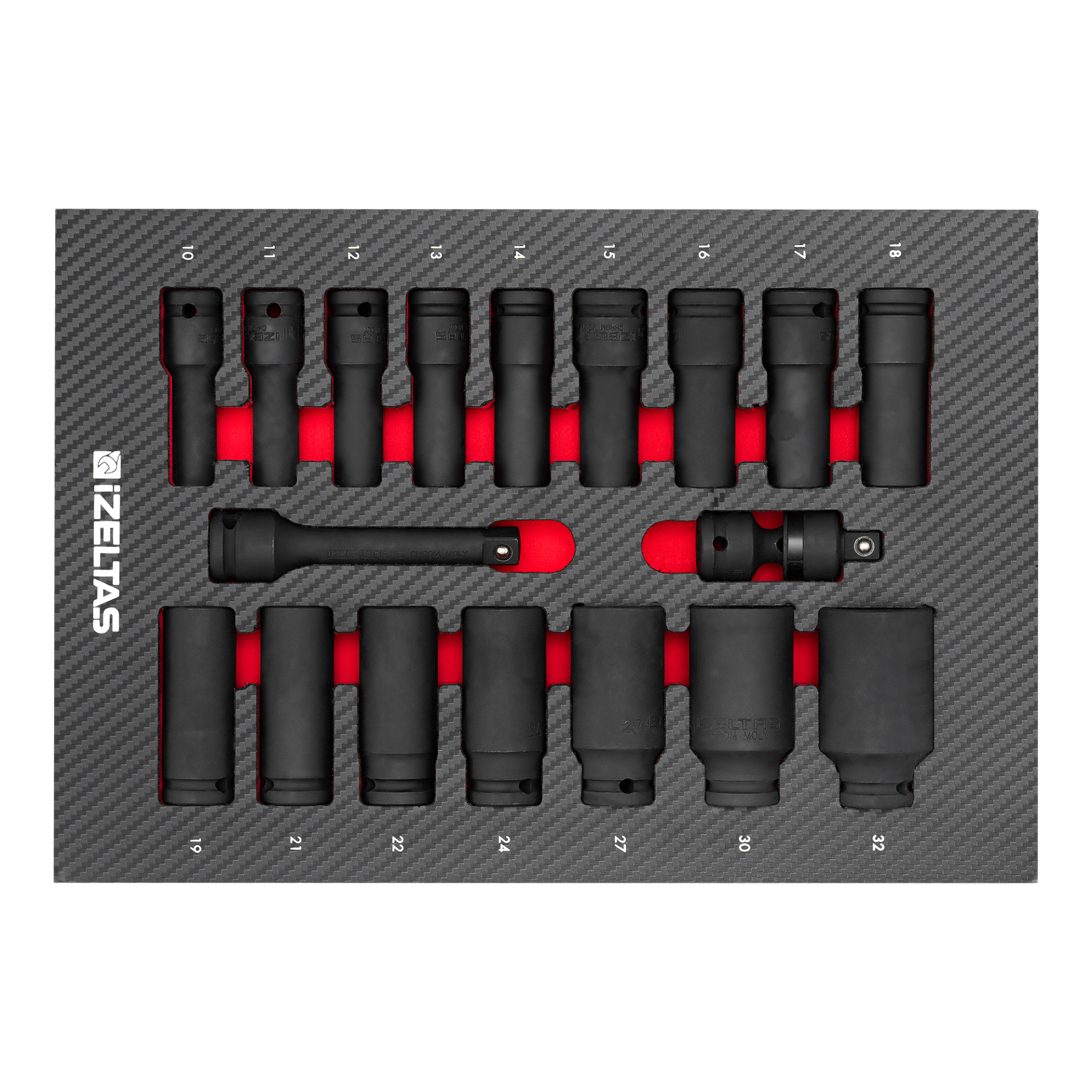 Набор усиленных удлиненных головок 1/2" в ложементе карбон 250x350х30мм 18 предметов IZELTAS