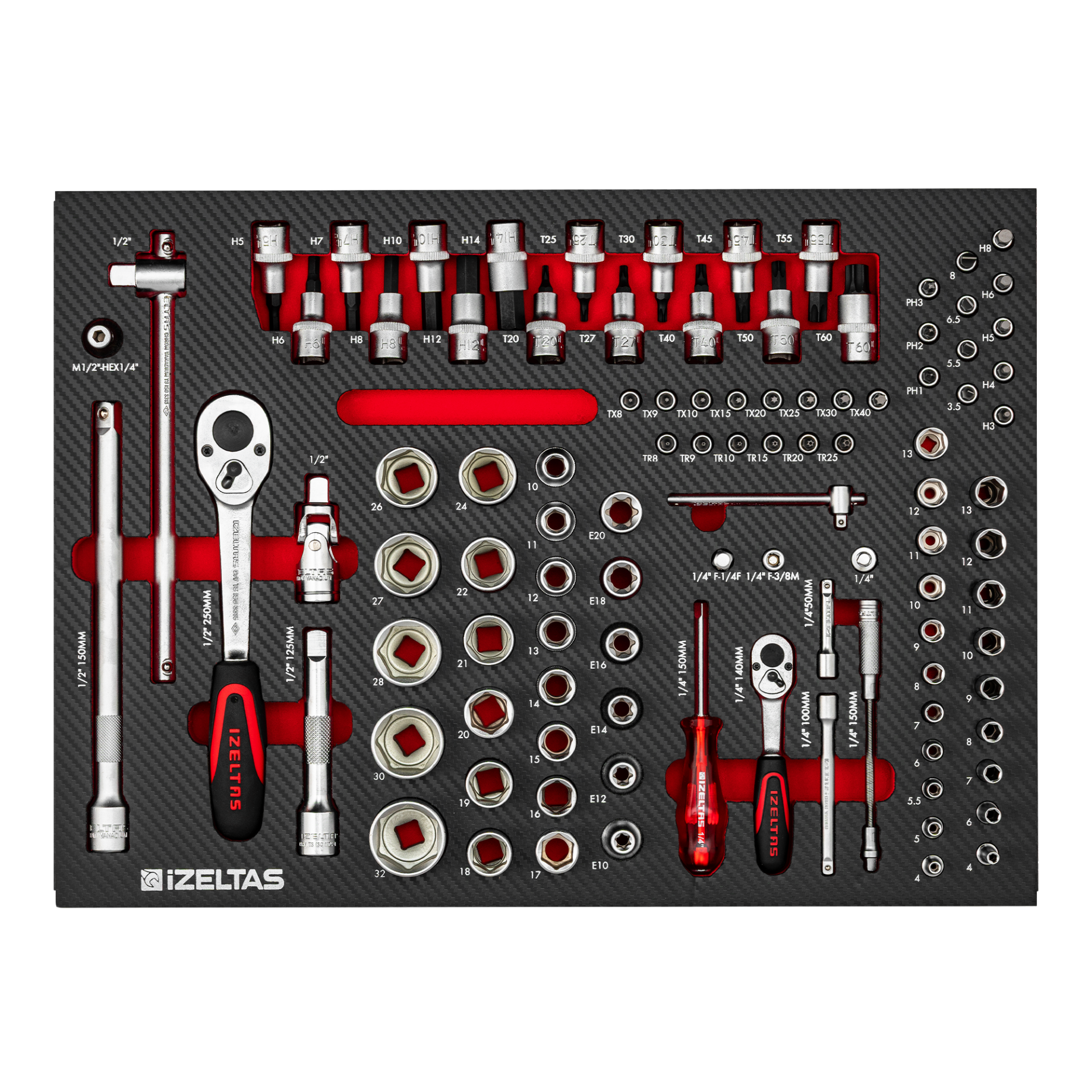 Набор головок и принадлежностей 1/2+1/4" в ложементе карбон 500x350х30мм 102 предмета IZELTAS