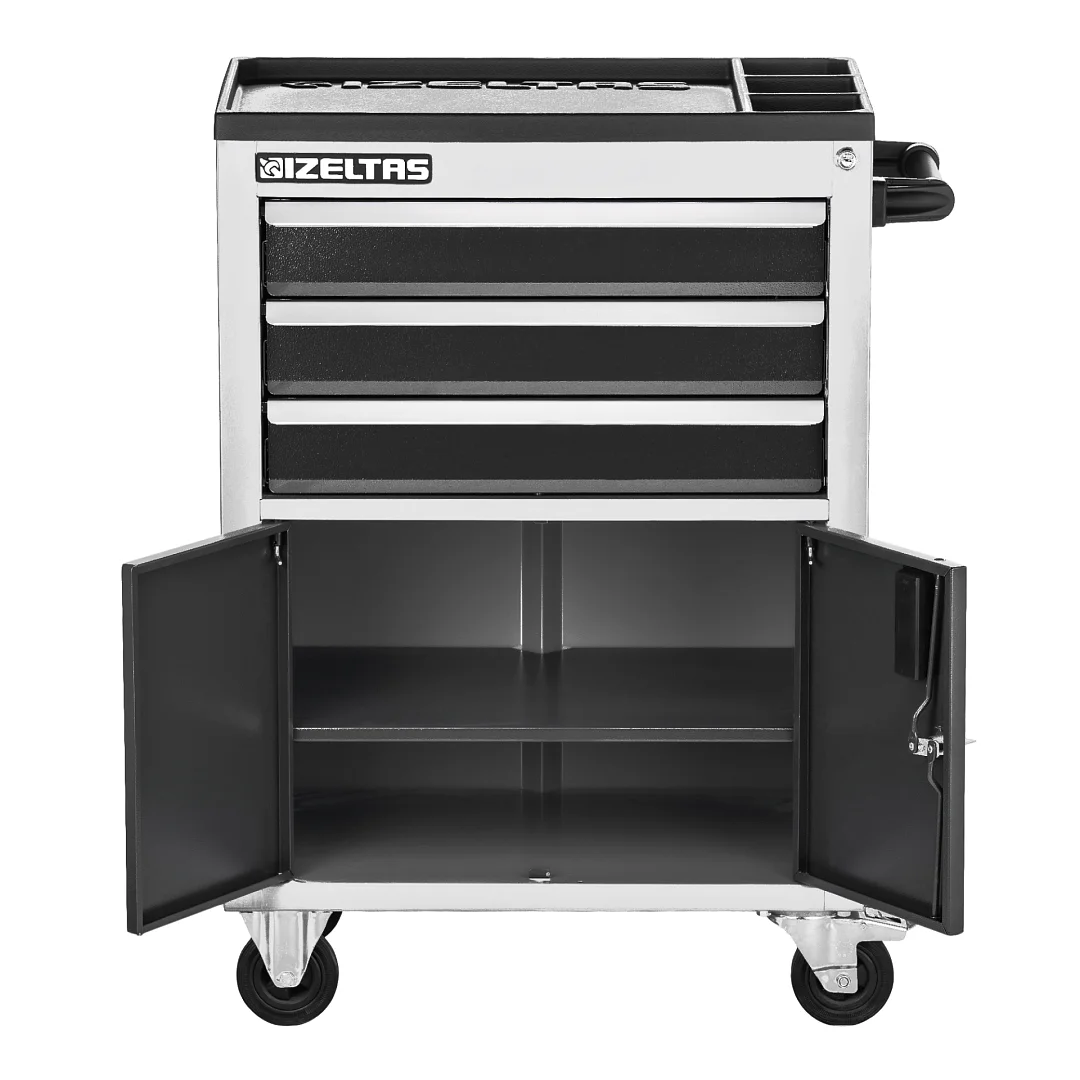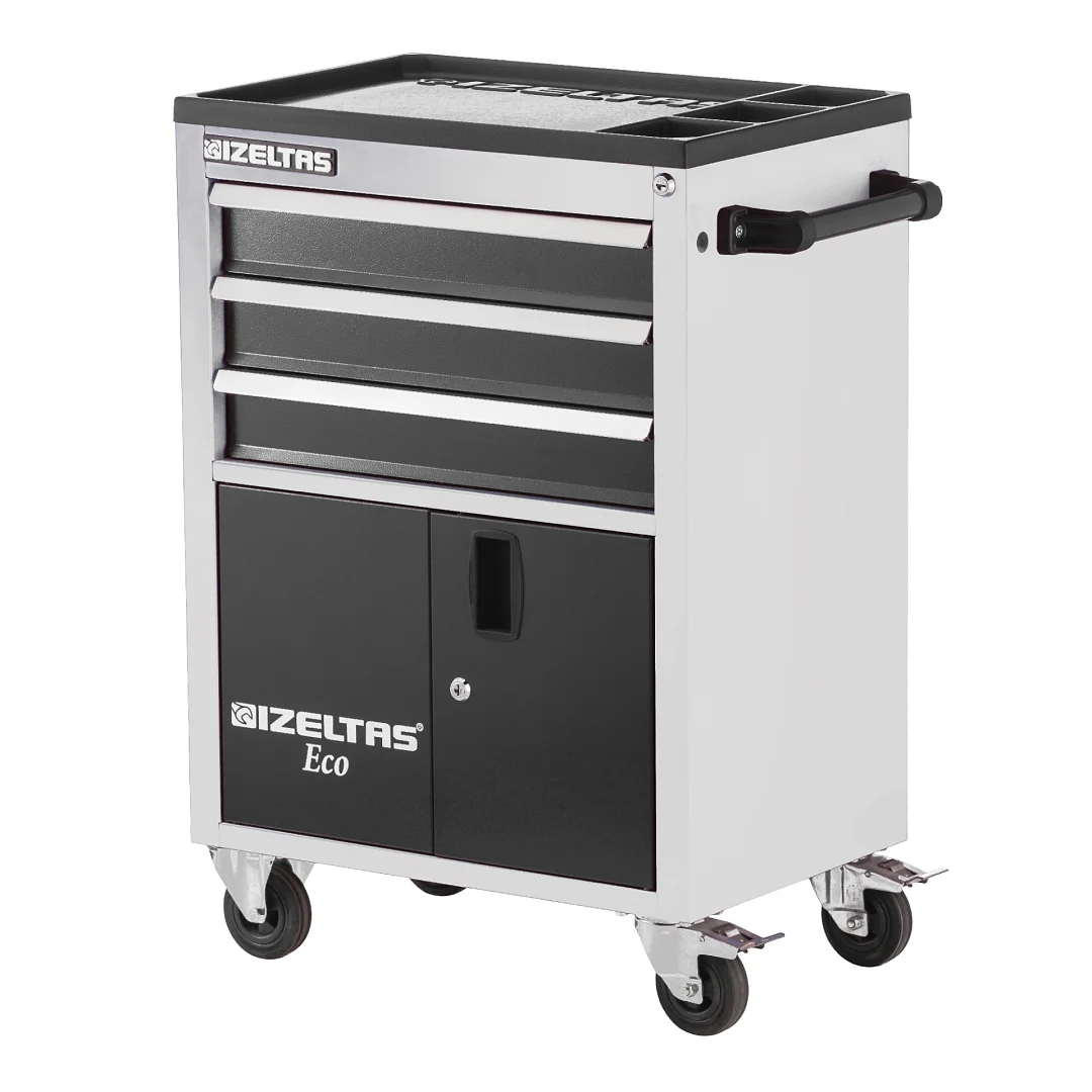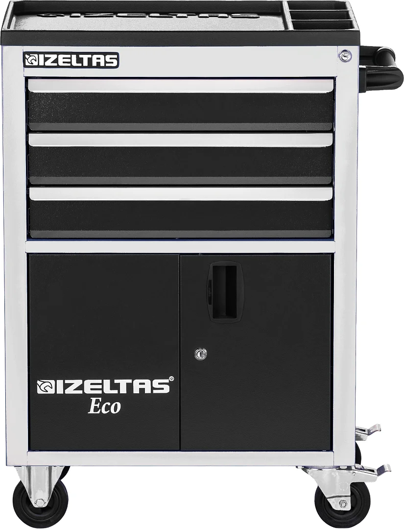 Тележка инструментальная серии ECO с набором инструментов 93 предмета, 3 выдвижных ящика, отделение с распашными дверцами, цвет - серо-черный, 8243001396/13000005238, IZELTAS