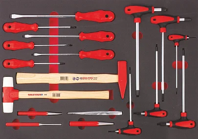Набор отверток и ударного инструмента в ложементе, состоит из набора шлицевых отверток, отверток с профилем PH, Т-образных шестигранных ключей, молотка, зубила, кернера, выколотки и бородка.