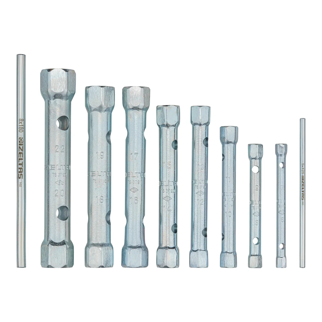 В составе восемь трубчатых ключей выполненных согласно DIN 896 из цельной стальной трубчатой заготовки с цинкованием, для защиты от коррозии: