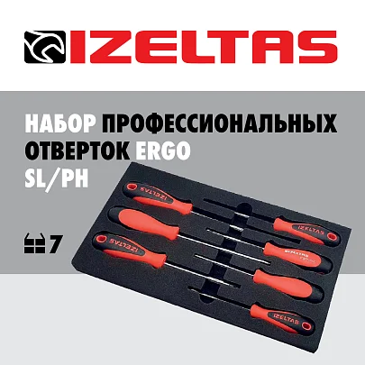 Набор отверток ERGONOMIK в ложементе, прямой (SL) и крестообразный (PH) шлиц, двухкомпонентная рукоятка, 7 предметов, IZELTAS, 4350008107, 13000001409