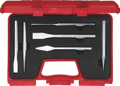 Содержит зубила 2х видов (плоское и узкое), бородок, кернер и выколотку, изготовленных из хромованадиевой стали, закаленной до высокой твердости.
