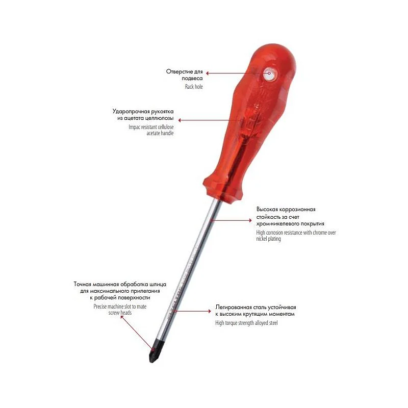 Благодаря отверстию в рукоятке отвёртку удобно хранить или использовать в качестве рычага (соблюдайте осторожность и не превышайте разумных усилий)