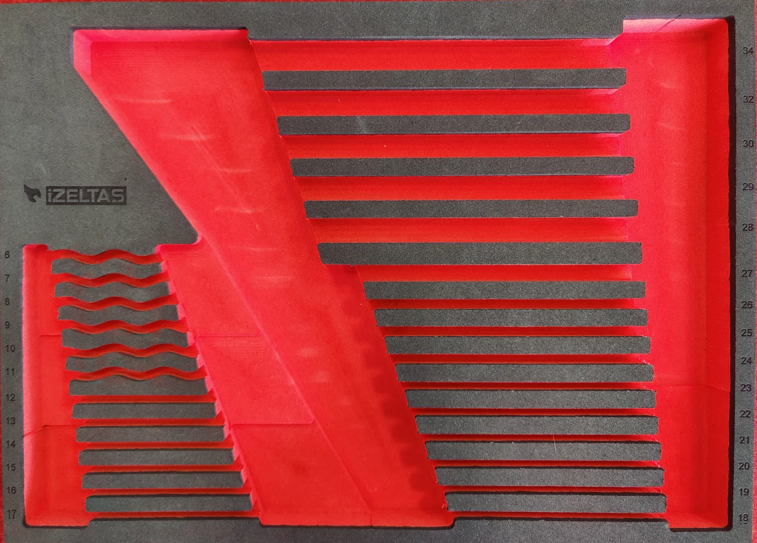 - Двухцветные мягкие ложементы из вспененного материала: черная пластина с фигурными вырезами и красное основание гарантируют хорошую визуализацию отстутствующего инструмента