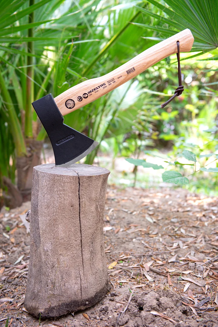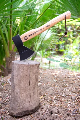 - Топорище плотно и надежно скреплено с рабочей частью топоракруговым клином из стали