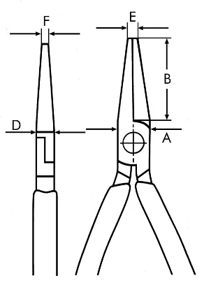 Ширина губок(А), мм 12,35 Длина губок (B), мм 43,52 Толщина губок, мм 7.8 Ширина концов губок (E), мм 2.3 Толщина концов губок (F), мм 1.9 Плоскости Шлифованные Общая Длина, мм 150 Ручки 2-х компонентный пластик Вес, г 86
